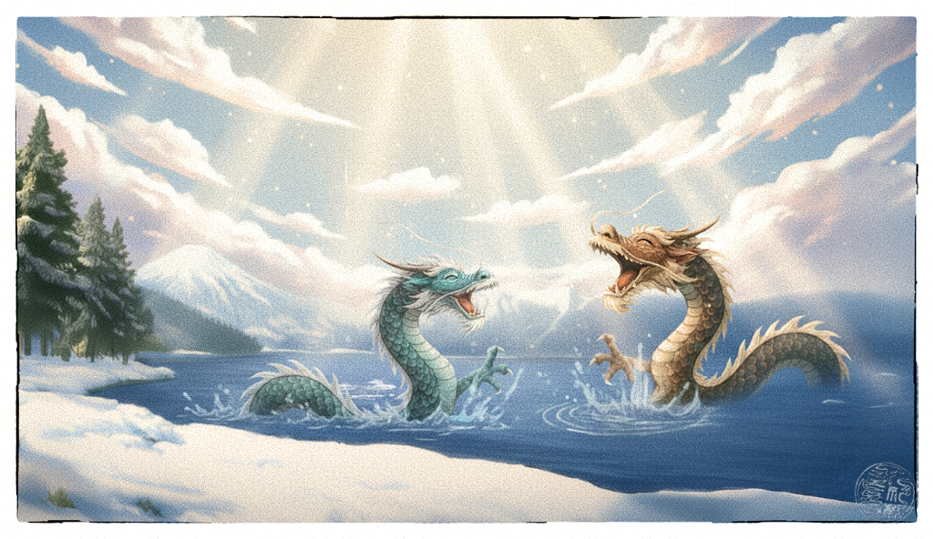Seitdem gelten Tatsuko und Hachirōtarō als die beiden drachenhaften Hüter der Seen, deren Wasser sie verbinden. An ruhigen Tagen soll man ihr leises Atmen in der Tiefe des Tazawa-Sees spüren können, und wenn sich der Mond in der Wasseroberfläche spiegelt, heißt es, dass Hachirōtarō sie besucht. So lebt ihre Liebe in den stillen, blauen Wassern weiter – eine Erinnerung daran, dass selbst in Transformation und Verlust etwas Unvergängliches entstehen kann.