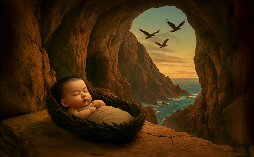Die Wiege aus Kormoranfedern, die man für seine Ankunft vorbereitet hatte, war unvollendet geblieben. Der Wind strich durch die losen Federn und ließ sie leise erzittern. Das Meer, sonst unruhig und laut, hielt Abstand, als hätte es seinem eigenen Kind Raum versprochen. Keine Welle drang in die Grotte ein.