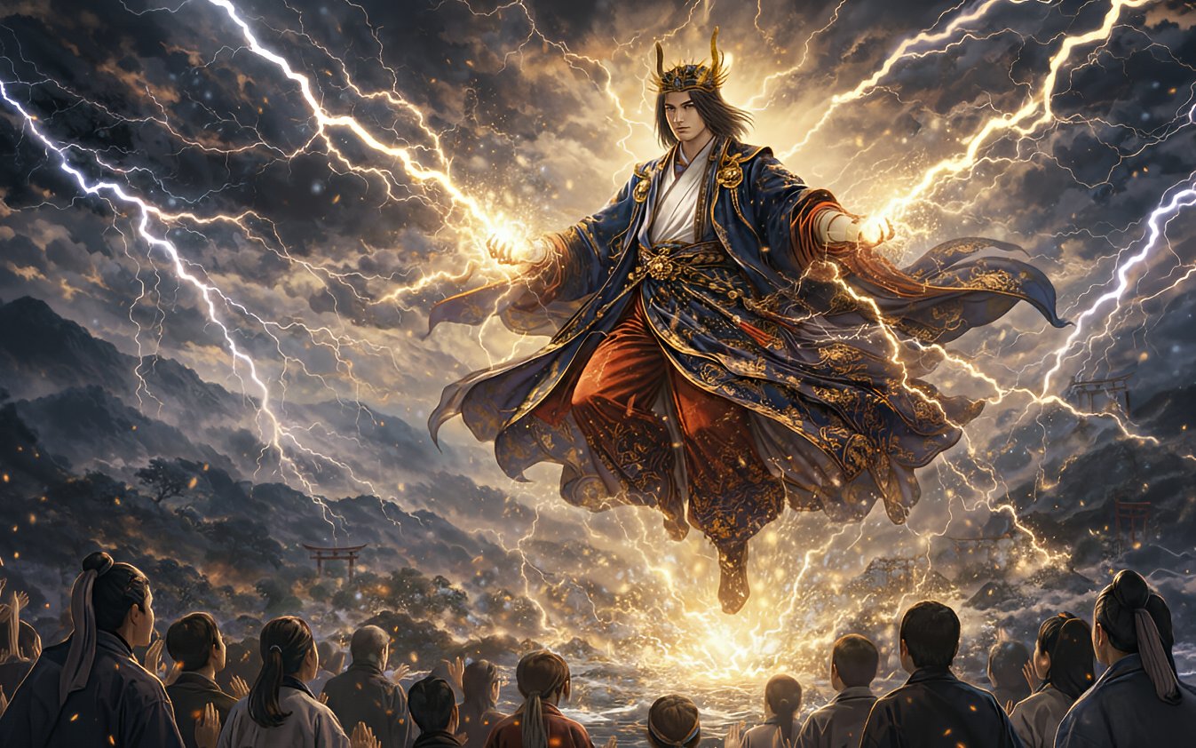 Eines Tages versammelte sich der Clan zu einem großen Fest. Der Junge trat vor die Versammelten, und in dem Moment, als Donner grollte und Blitze den Himmel zerrissen, stieg er empor, getragen von Sturm und Licht.