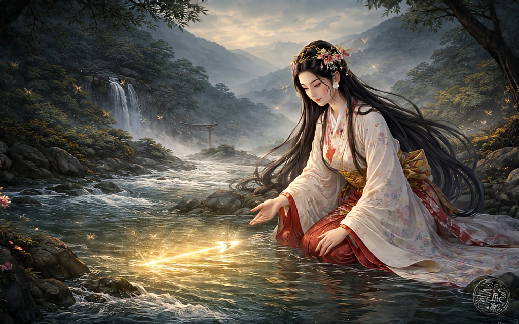 Lange bevor Kyoto zur Kaiserstadt wurde, als die Ebenen noch still waren und die Berge als Wohnorte der Götter galten, lebte am klaren Wasser des Kamo-Flusses eine Frau von edler Herkunft: Tamayorihime-no-Mikoto. Sie war bekannt für ihre Reinheit, ihre spirituelle Kraft und ihre Nähe zu den Kami.