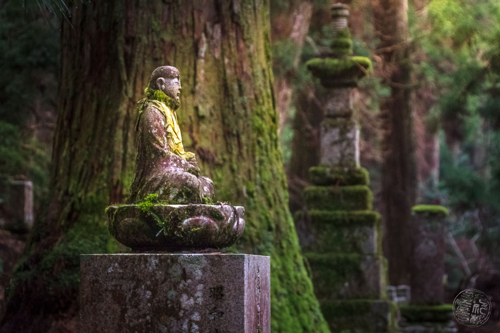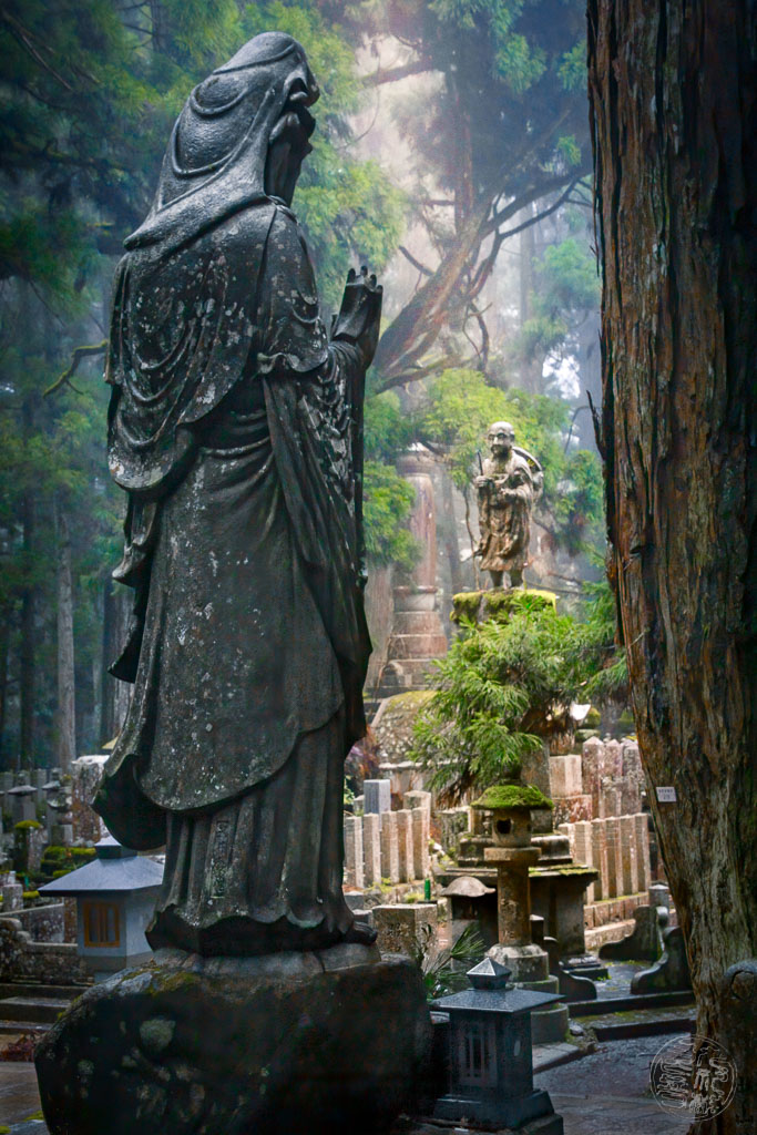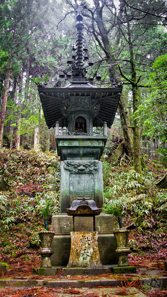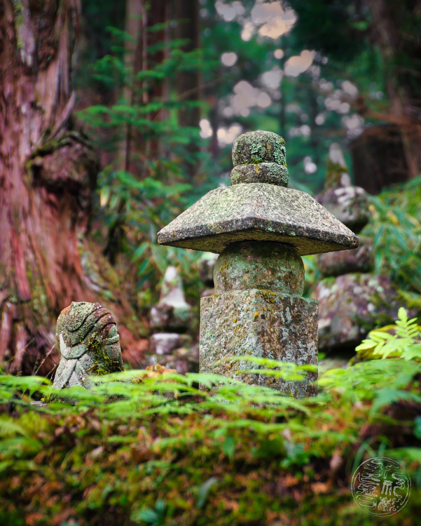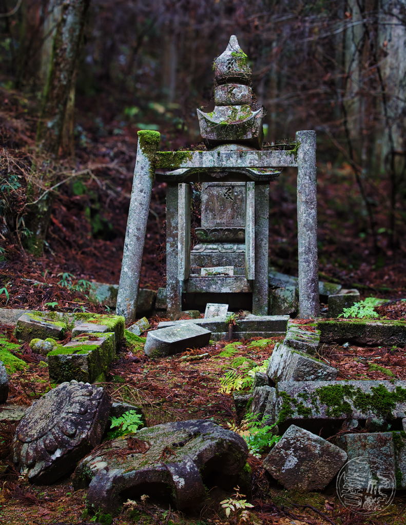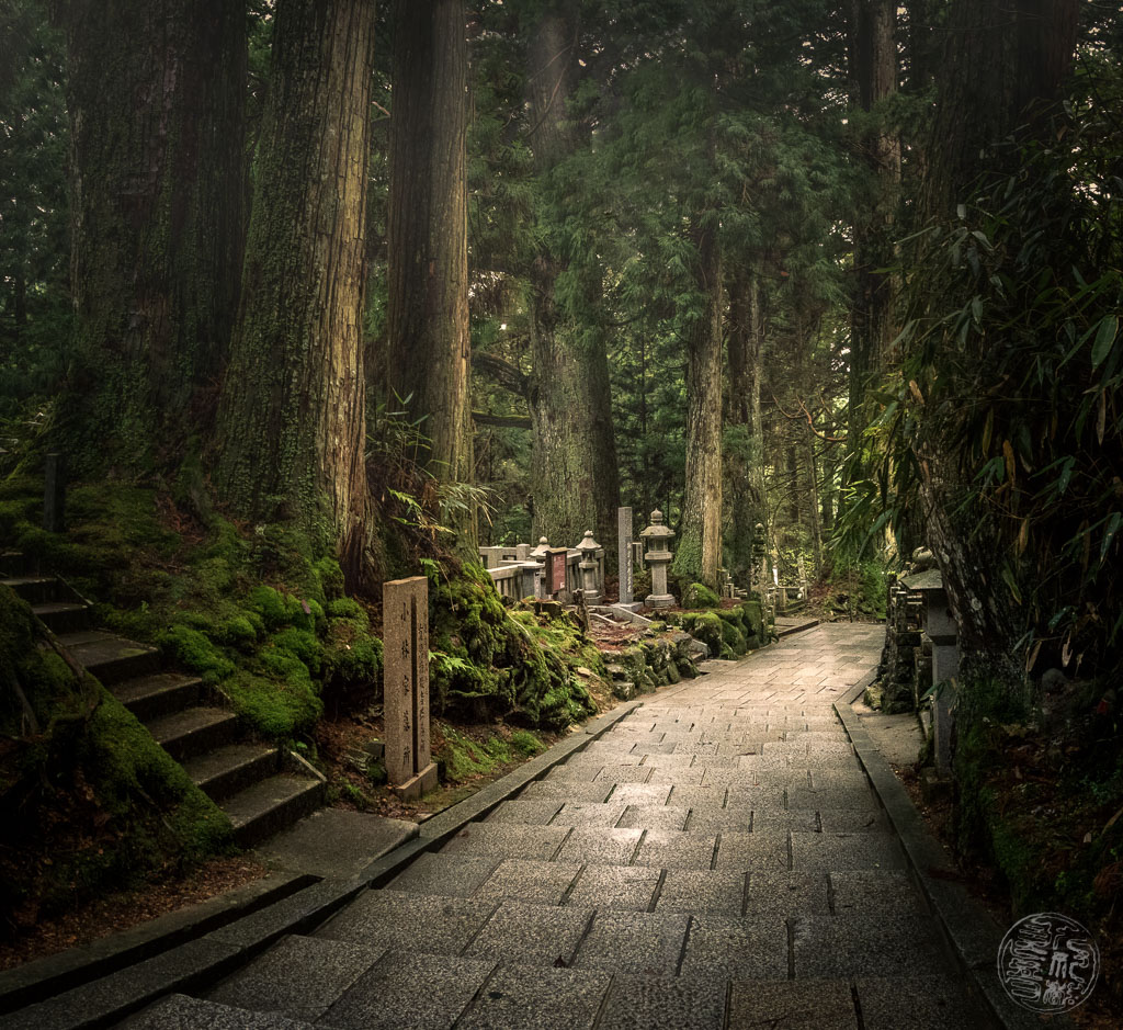Am Morgen folgte Taro einem schmalen, kaum sichtbaren Pfad tief in den Wald. Der Nebel war so dicht, dass er die Hand vor Augen kaum sehen konnte. Schließlich stand er vor dem Mausoleum von Kūkai. Der Stein war alt, verwittert, mit Moos bedeckt, doch eine unheimliche Präsenz durchdrang den Ort.