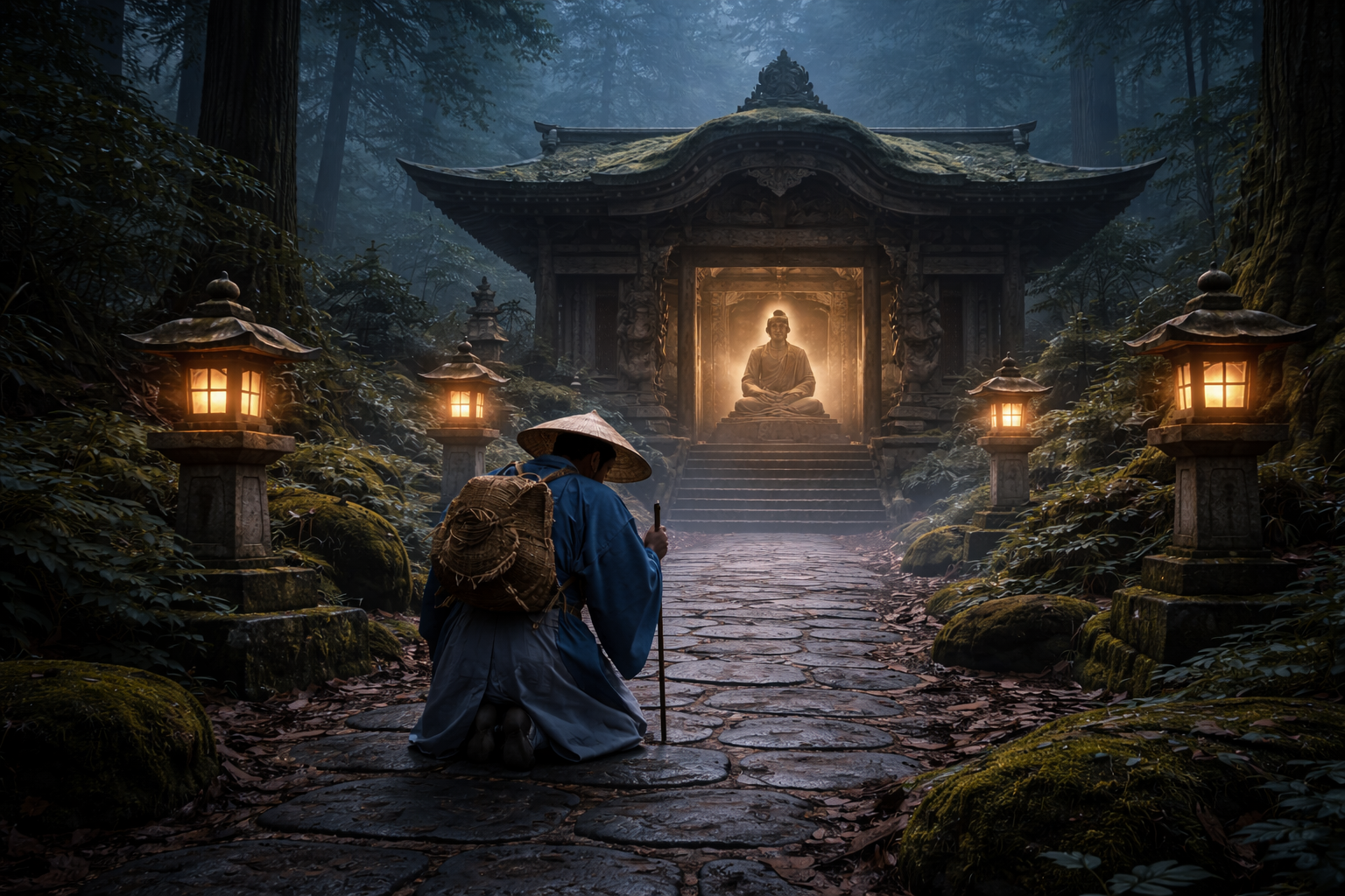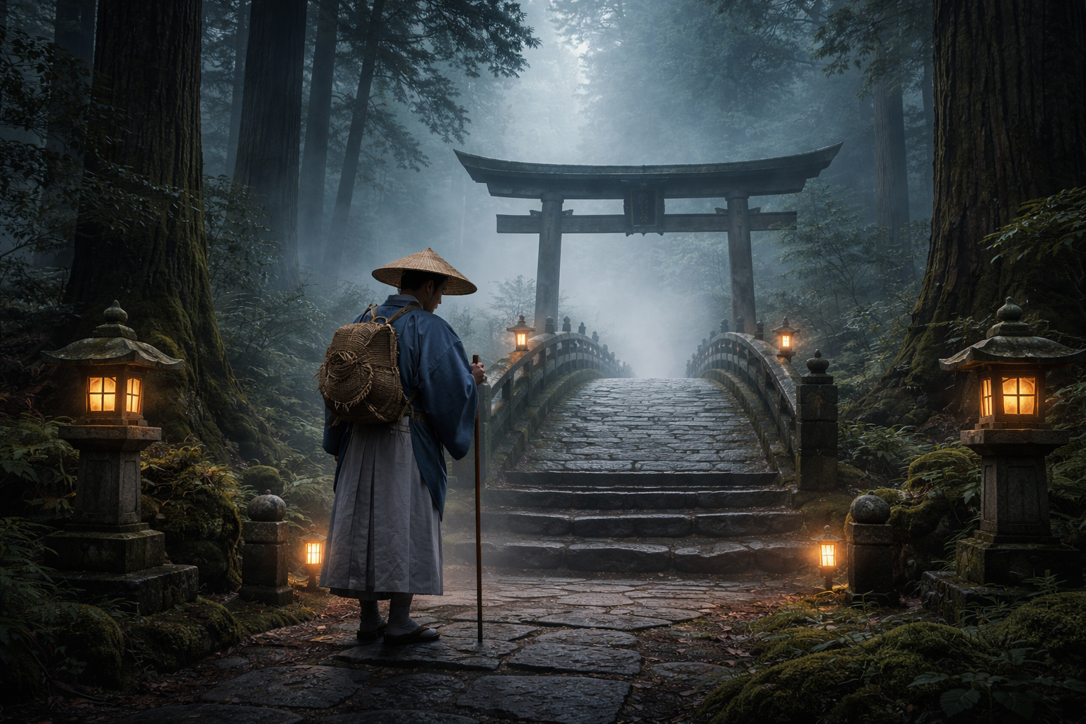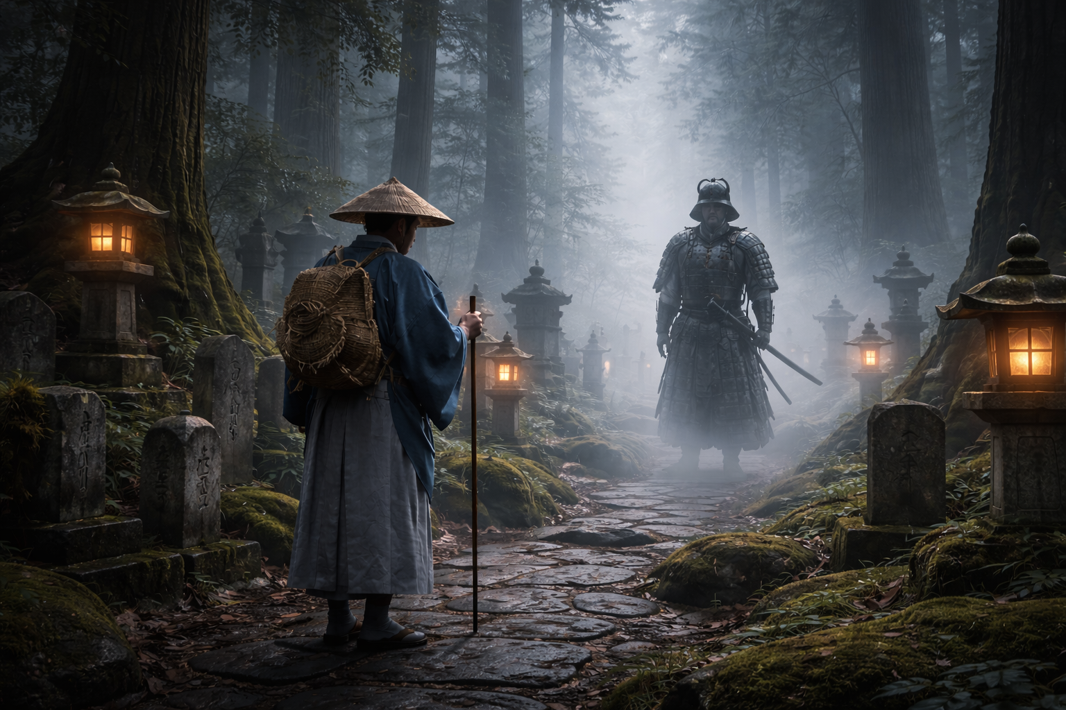 Dann verschwand Kūkai, und Taro fand sich plötzlich am Ichinohashi-Tor wieder. Er verstand: Der Berg hatte ihn geprüft – Geduld, Mut, Respekt – nur wer reinen Herzens war, durfte die Geheimnisse von Kōya-san erleben.