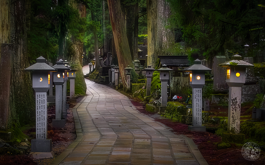 Die Nacht legte sich schwer über Okunoin, den größten Friedhof von Kōya-san. Der Nebel kroch über die moosbedeckten Grabsteine, legte sich wie ein dichter Mantel über die Steine und Wege. Taro setzte sich auf einen Stein und lauschte. Dann geschah es: Die Laternen entlang des Hauptwegs begannen zu flackern, ein leises Summen erfüllte die Luft, als hätten sie ein eigenes Bewusstsein.