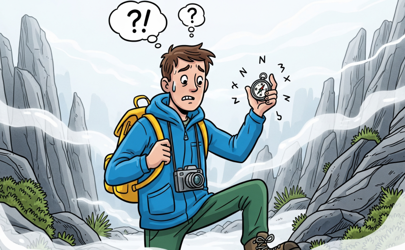 Also versuchte ich eine neue Idee: fünfmal an verschiedenen Stellen auf den Kompass schauen und die Richtung nehmen, die am häufigsten „Norden“ war. Ich stapfte los, kletterte über rutschige Steine, zog mich an Baumstämmen hoch – und irgendwann musste ich lachen, weil ich aussah wie ein tapsiger Bär, der einen Berg hoch will.