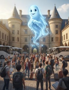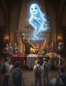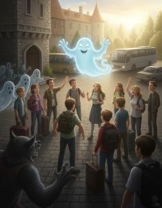 Am Abend kam er wieder, vollgepackt mit vielen verrückten Kostümen wie z. B. dem Kostüm von Frankenstein, Hui Buh, dem Werwolf und was es sonst noch so gibt. Er zeigte alles Egon, der die Kostüme echt gruselig fand. Jetzt kam das Wichtigste: Frank stellte Egon seinen Kursteilnehmern vor. Zuerst waren sie erschrocken, dass es wirklich Gespenster gibt, aber nachdem sie sich an den Anblick von Egon gewöhnt hatten, waren sie begeistert, sich mit Egon zu unterhalten.