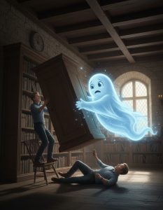 Frank ließ los und fiel zu Boden, aber der Schrank fiel weiter und drohte, ihn zu zerquetschen. Doch bevor es dazu kommen konnte, griff Egon ein und hielt den Schrank fest. Frank war verwirrt und erschrocken, als der Schrank nur wenige Zentimeter vor ihm zum Stehen kam. Als er den Schreck überwunden hatte, machte Egon sich sichtbar, was Frank sofort den nächsten Schlag versetzte, aber auch das hatte er schnell überwunden, denn er hatte Egon zu danken, dass ihm nichts passiert war, und das tat er auch sofort.
