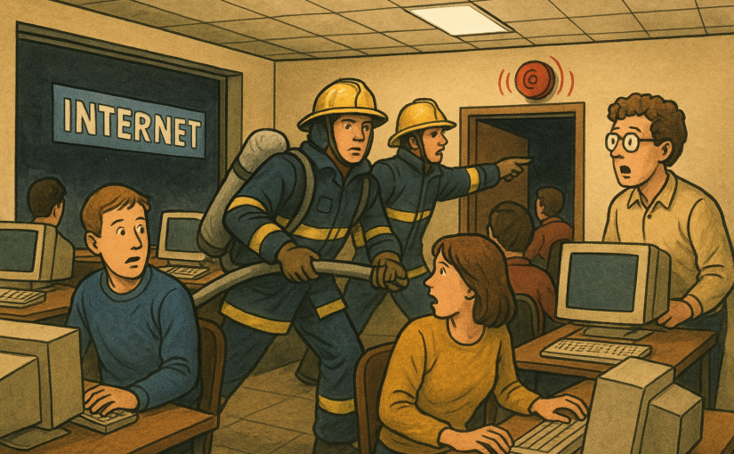 Es war Mitternacht, als plötzlich ein leises, gleichmäßiges Piepen den Raum erfüllte. Der Feueralarm. Ich hob den Kopf. Doch niemand reagierte. Neben mir spielte jemand ein Computerspiel, im hinteren Eck chattete ein Student mit Freunden, und der Besitzer saß gelangweilt an der Kasse. Kein Aufschrei, kein Innehalten. Das Geräusch wurde zu einem Teil der Geräuschkulisse – wie das Summen der Neonröhren. Und auch ich, zunächst unruhig, tippte weiter.